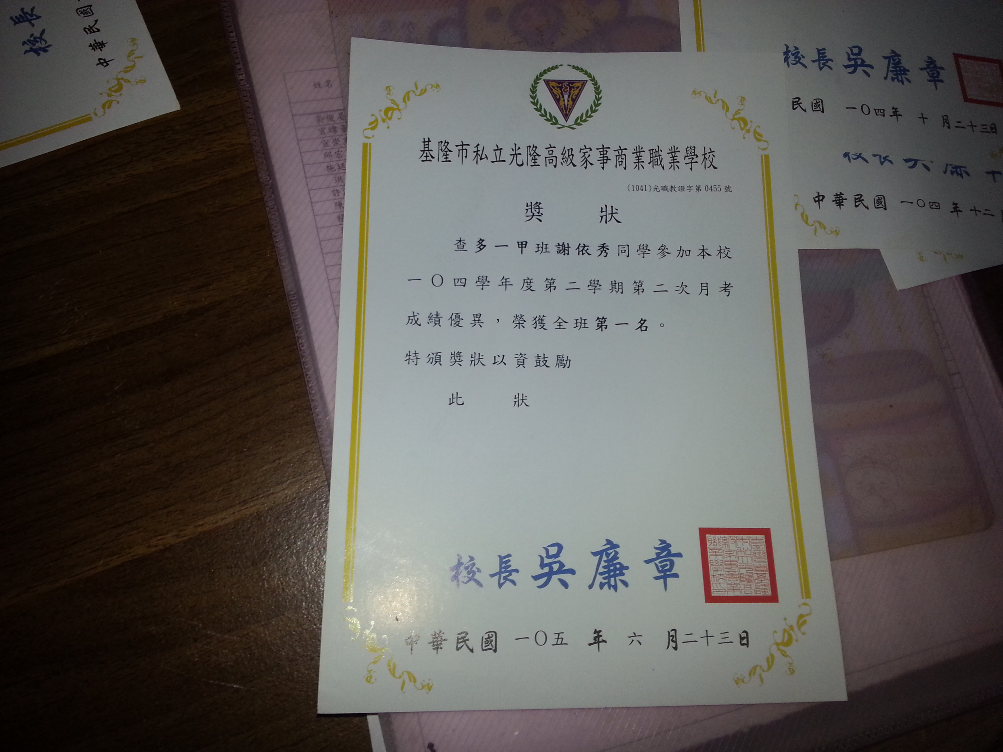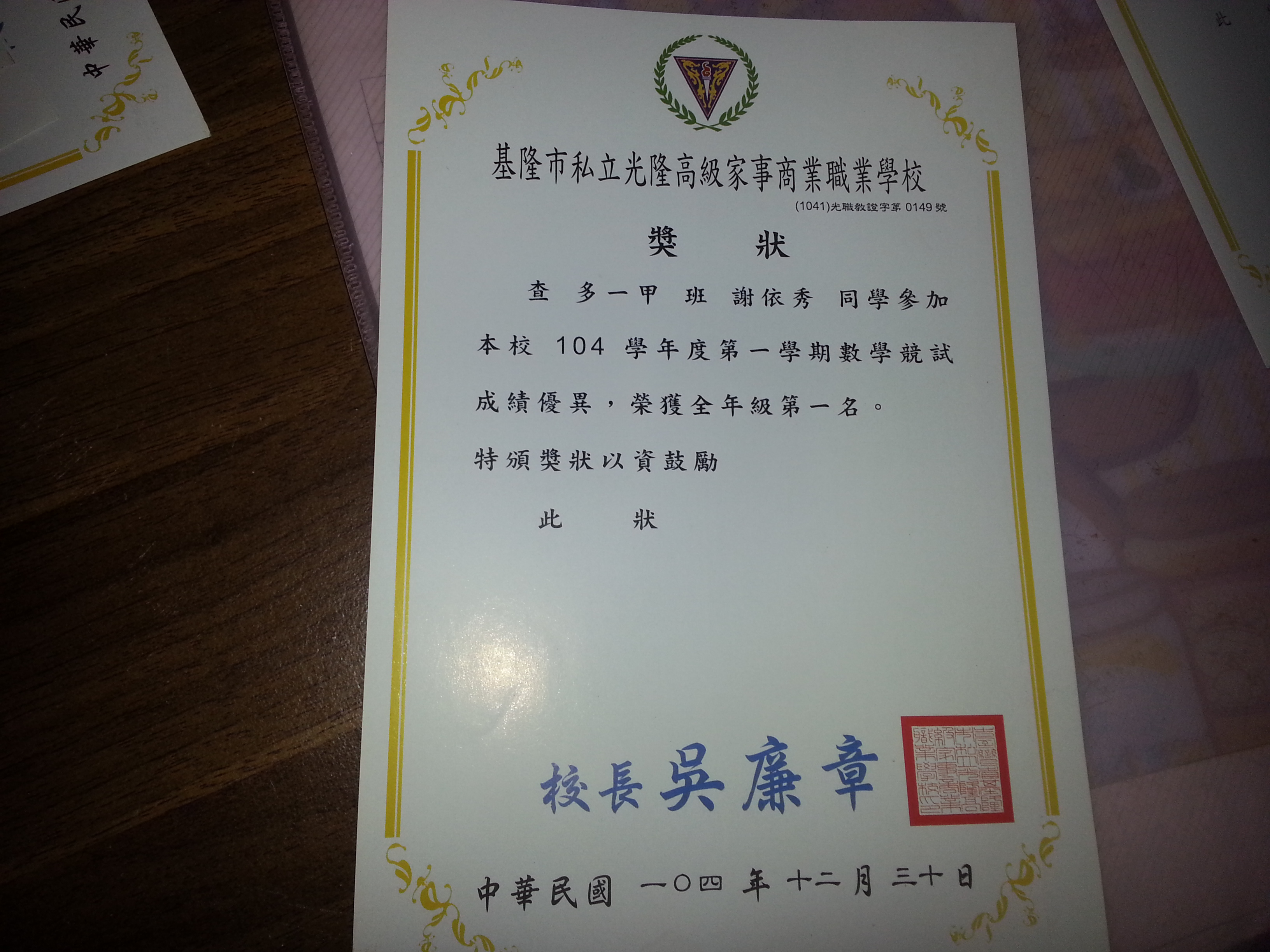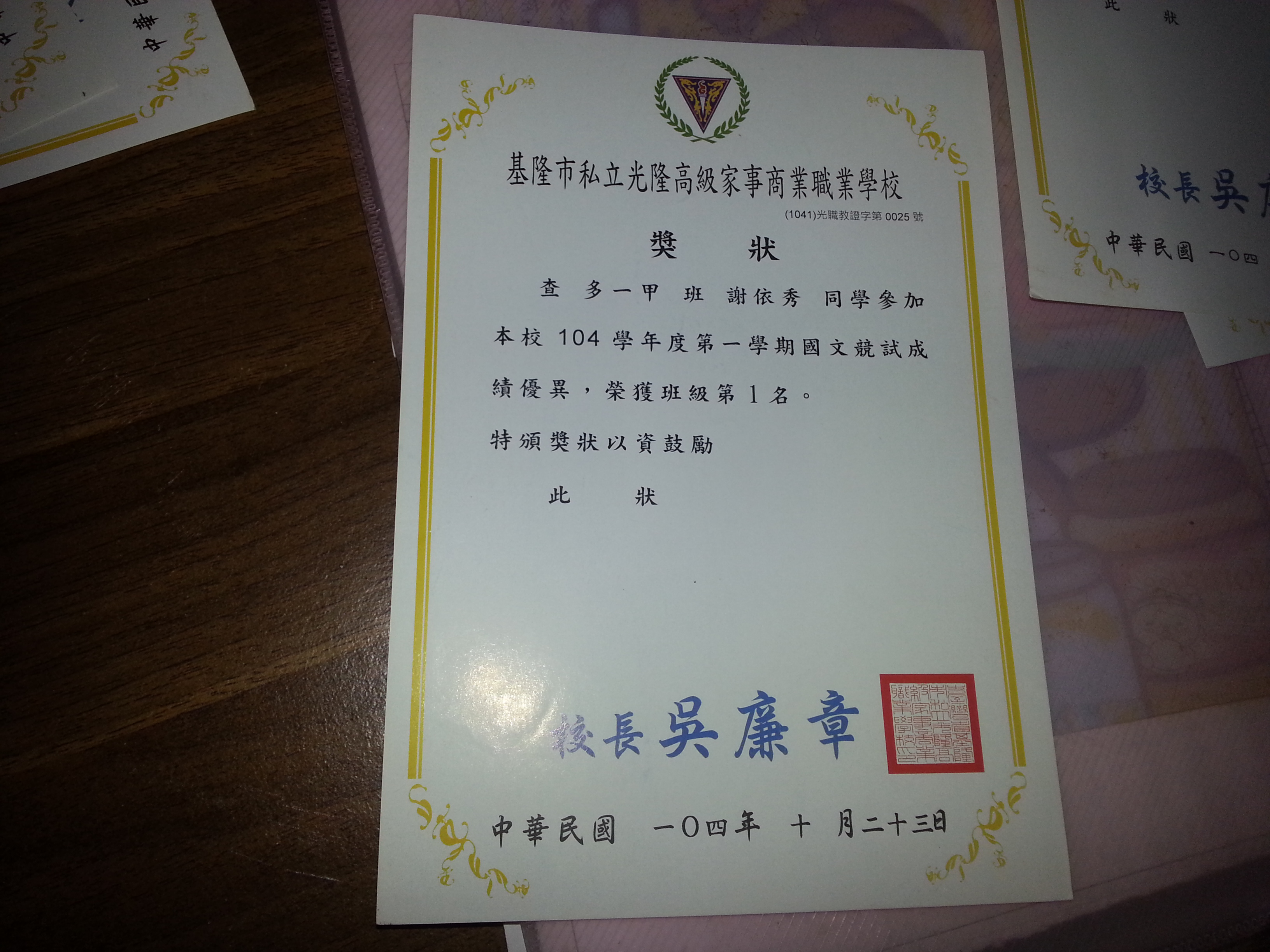 拿到這張獎狀我覺得非常光榮